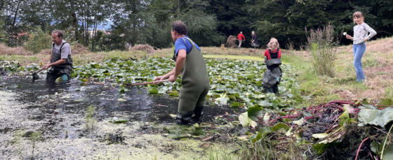 Samstag, 27. September 2025Erfolgreicher 16. Unterentfelder Mosttag trotz schlechter ObsternteViele Besucherinnen und Besucher wollten sich den traditionel-len Mosttag nicht entgehen lassen und wurden nicht enttäuscht.Wie schon im letzten Jahr kam auch heuer die Bächlihalle zum Ein-satz, weil die Temperaturen eher im kühlen Bereich waren. Die Besu-cherinnen und Besucher kamen auch bei der 16. Durchführung des Unterentfelder Mosttages auf ihre Rechnung. Auch wenn die Obst-ernte in der Region recht mager ausfiel, konnten der neue Störmos-ter Damian Krömler und sein Team den ganzen Nachmittag zeigen, wie Süssmost entsteht. Dies nicht zuletzt auch weil der Natur- und Vogelschutzverein Unterentfelden knapp 300 kg Most-Obst zur Ver-fügung stellte. Neu war der Verkauf von Galegge-Hochstammobst und Apfelschämpis.Zusammen mit der Chabishoblete, der wunderschönen Apfel- und Birnenausstellung von über 70 Sorten aus der Region Entfelden, dem Verkaufsstand von Trachtpflanzen für Wildbienen, dem Kafi-Egge, der Kinderecke und natürlich dem Öpfelchüechlistand, wurde das Thema Herbst schön abgerundet. Toll, was der Biologische Gartenbauverein und der Natur- und Vogel-schutzverein jedes Jahr auf die Beine stellen!Text: Thomas Hersche; Fotos: Thomas Hersche, Martin Flucher, Stefan BallmerNeugierige Kinder und aktive Erwachsene nach der SommerpauseIm August fängt die Schule wieder an, das steht in vielen Termin-kalendern. Aber auch der Natur- und Vogelschutzverein Unter-entfelden hatte diesen August viel Programm. Die Anlässe mobi-lisierten interessierte Kinder und engagierte Erwachsene.„Was quakt und zirpt am Weiher?“, das fragten sich 16 Kinder am gleichnamigen Ferienpass-Anlass unseres Vereins. Am 6. Augustzogen wir los und erforschten die Weiher im Naturschutzgebiet „Un-teri Quellmatte“ zwischen Entfelden und Suhr. Mit grosser Geduld entdeckten die Kinder Wasserschnecken, fanden Larven von Libellen und staunten über die jungen Bergmolche. Wer hätte gedacht, dass viele fliegende Insekten ihr Leben als Larven unter Wasser ver-bringen? Zum Glück gab es Fachbücher, Bestimmungshilfen und Tipps von versierten Vorstandsmitgliedern – die Fragen zu den Fun-den der Kinder waren ganz schön kniffelig zu beantworten!Die Pflegearbeiten bei den Amphibienweihern im Landenhofwurden erstmals im August anstatt im Januar durchgeführt (diesmal am 16. August). Grund dafür ist, dass der Amphibienzaun an der Quartierstrasse beim Landenhof überflüssig wurde: Durch die Weiher im Wald müssen Frösche und Kröten seit einigen Jahren nicht mehr vor der Wanderung in die Quartierteiche vor Autos geschützt werden. Die Sammeleimer hinter dem Amphibienzaun blieben leer. Die Tiere finden mit den Waldweihern wieder geeignete Laichge-wässer im Wald, welche sie gefahrlos nach der Winterruhe erreichen können. So konnten sich die Helfenden am 16. August komplett auf die Pflege der Landenhof-Weiher konzentrieren.Grobe Arbeiten wurden vor dem Schiibestand-Pflegeeinsatzam 29. August verrichtet: Wegen der vorgängigen Regentage war das Mä-hen mit dem Balkenmäher im unwegsamen Gelände am Waldrand in der Nähe des «Fritzebrünneli» eine Herausforderung für Mensch und Maschine. Darum galt es am Pflegeeinsatz selbst nicht nur das ge-trocknete Gras zusammenzurechen, sondern wir mussten auch mit der Sense vielerorts in Handarbeit nachbessern. Auch entfernten wir im Teich in strenger Handarbeit einen Teil der Seerosen, um der Verlandung des Teiches entgegenzuwirken. Klar, dass die Grilladen im Anschluss an diesen jährlichen Pflegeein-satz umso besser schmeckten!Text: Lukas Kammermann