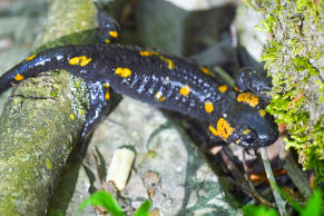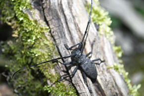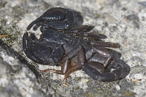 Italienischer Skorpion ( Euscorpius italicus; Campora TI). Die Tiere sucht man mit UV-Taschenlampen in den Trockenmauern nachts. Dort fluores-zieren sie beeindruckend!Trauerbock (Morimus asper funereus; Campora TI).Gefleckter Feuersalamander (Salamandra Salamandra; Monte TI). Bei uns kommt der gebänderte Feuersalamander vor. Dieser ist nur nachts unter-wegs. Im Tessin lebt der meist grössere Gefleckte Feuersalamander, oft auch am Tag anzutreffen.